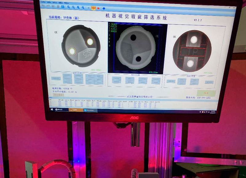 本實用新型通孔檢測設備,解決了溫控器陶瓷導向架中心孔變形、粉塵、毛刺、堵孔等不良問題,多年來可做到客戶零投訴率?! 〖夹g領域: 本實用新型屬于陶瓷產品加工技術領域,具體涉及一種陶瓷產品通孔檢測設備?! ‖F(xiàn)有技術存在以下問題:現(xiàn)在的陶瓷產品往往通過人工進行通孔檢測,進而進行篩分,造成檢測篩分時間長,效率低、成本高、易漏檢?! 嵱眯滦蛢热荩骸 榻鉀Q上述背景技術中提出的問題。本實用新型提供了一種陶瓷產品通孔檢測設備,具有檢測快速,篩分便攜,自動化程度高,分辨率高,無漏檢等的特點?! 閷崿F(xiàn)上